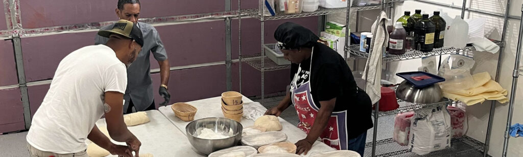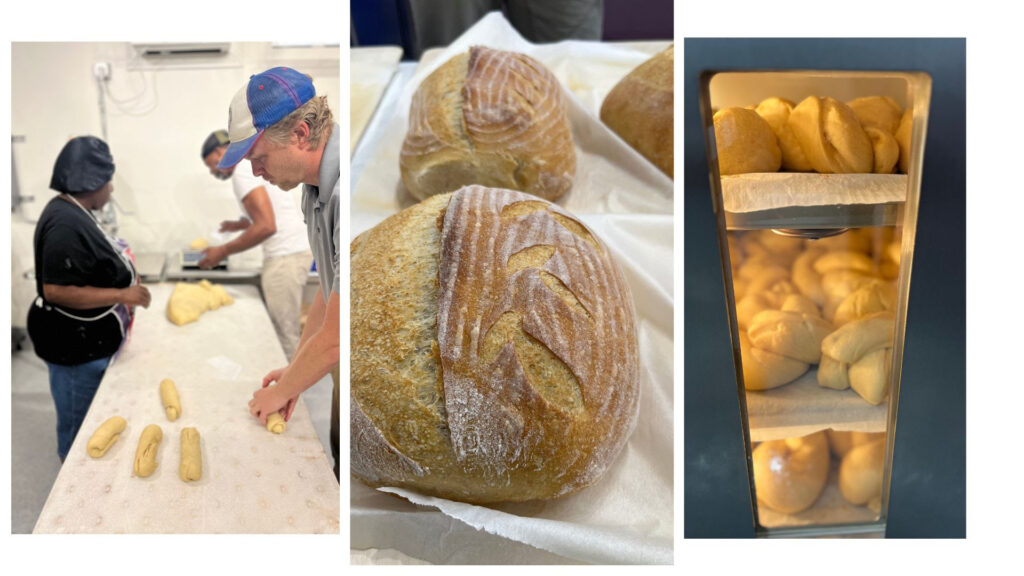 The disorganized storage for ministry supplies and bagged up clothing for current…and former residents, was cleared out, cleaned up, and outfitted with equipment for teaching baking and producing enough bread to employ the residents; a fully operational micro-bakery with formerly unhoused men and women baking hundreds of loaves a day.